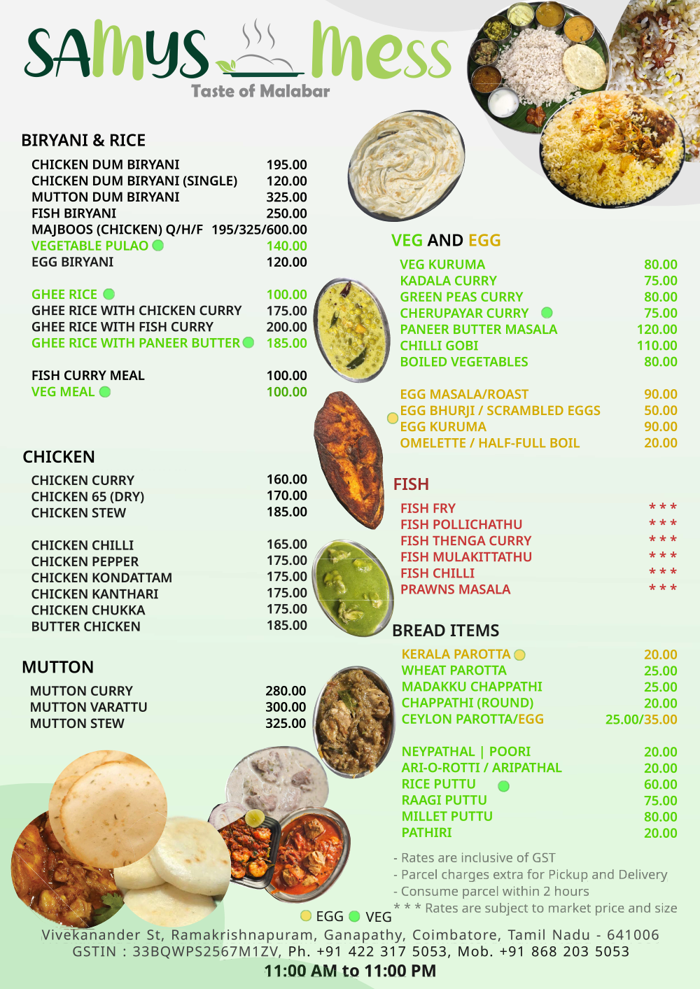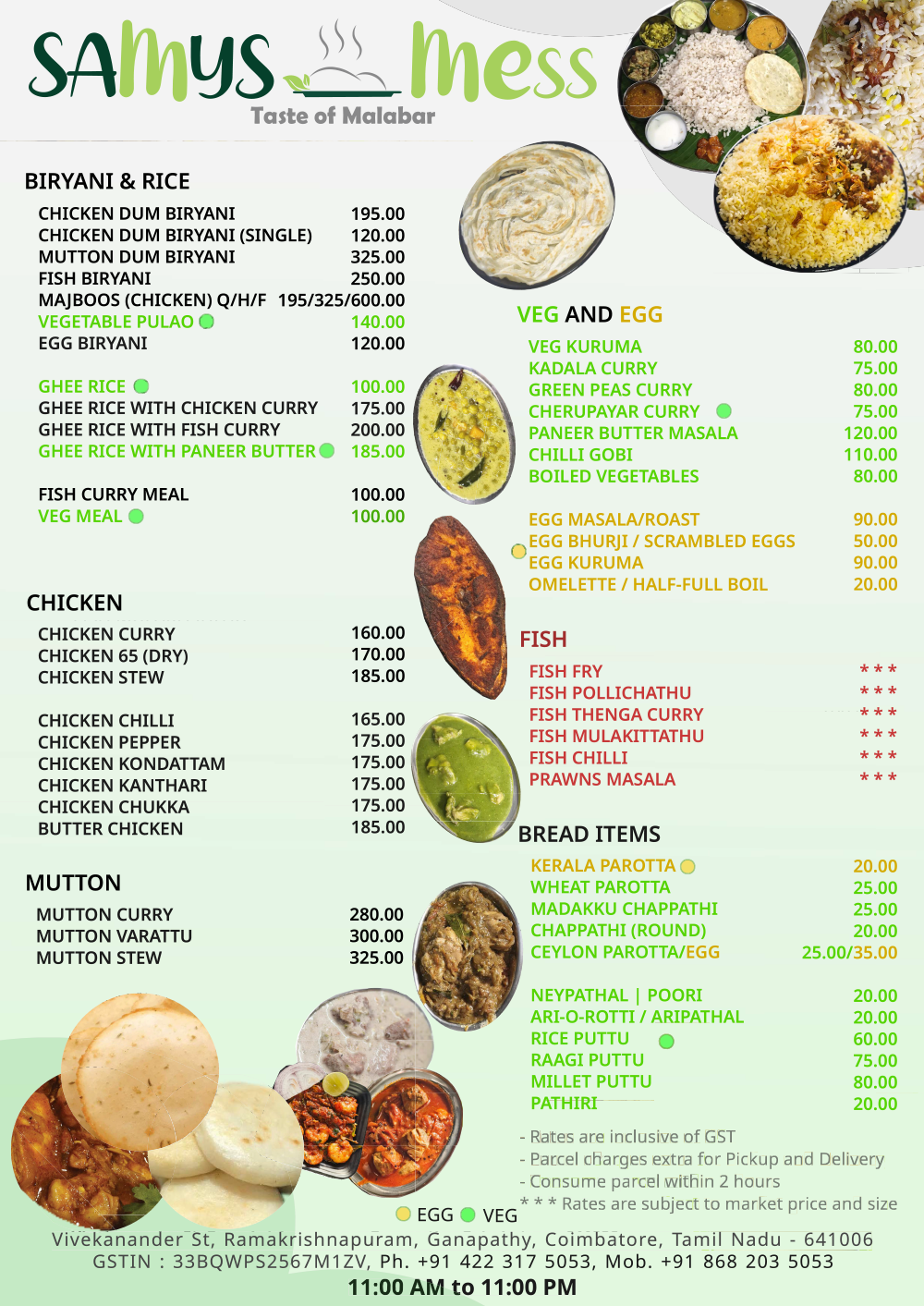 Welcome to SAMYS MESS, your destination for authentic Malabar and Thalassery cuisine in Coimbatore — serving home-style biryanis, Kerala meals, seafood specials, and traditional desserts made with love.